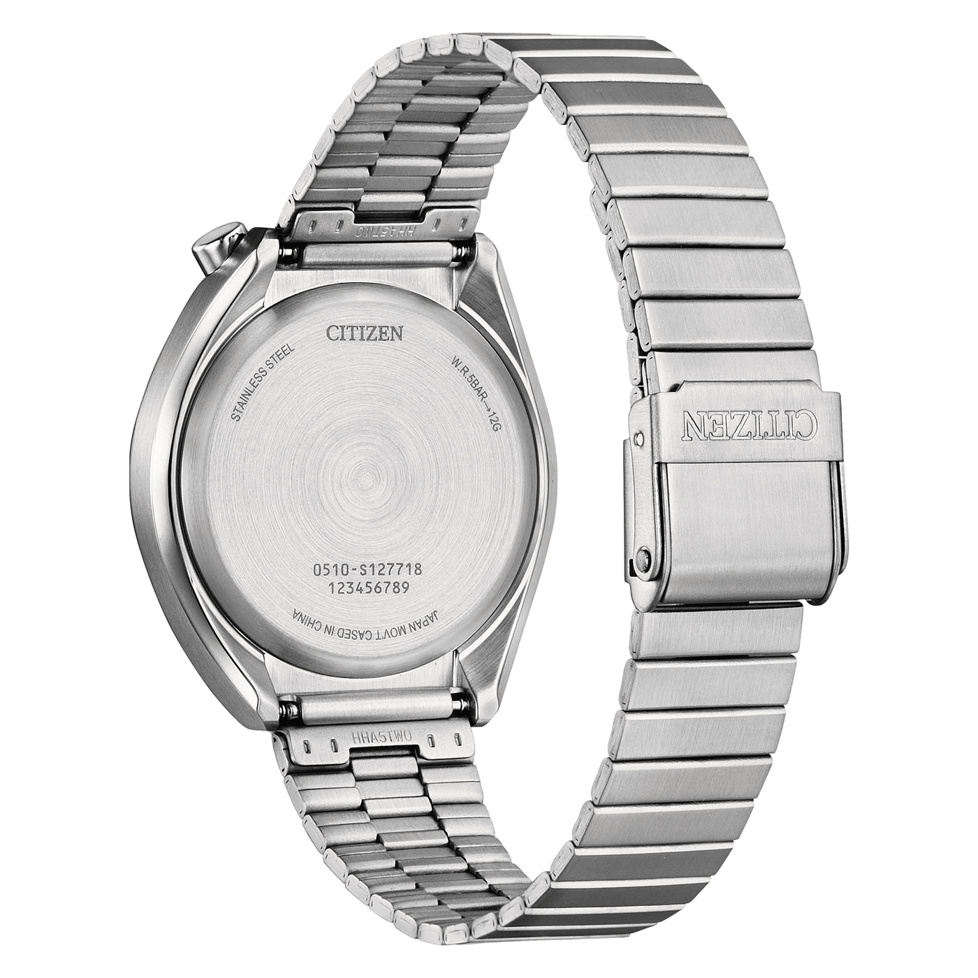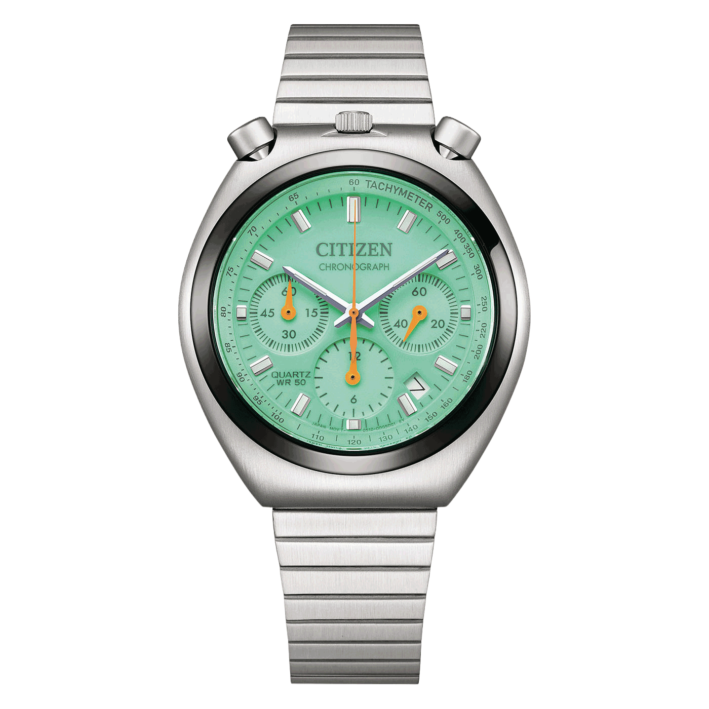 À l’origine, le design de la TSUNO CHRONO naît d’un geste créatif audacieux. En faisant pivoter le mouvement de 90 degrés, CITIZEN transforme la lecture classique du chronographe et donne naissance à une montre immédiatement identifiable. Le modèle historique de 1973, animé par un calibre automatique, se distingue par son cadran panda, habillé d’aiguilles de chronographe orange et d’un affichage jour-date intégré à 6 heures, traité comme un troisième compteur.
