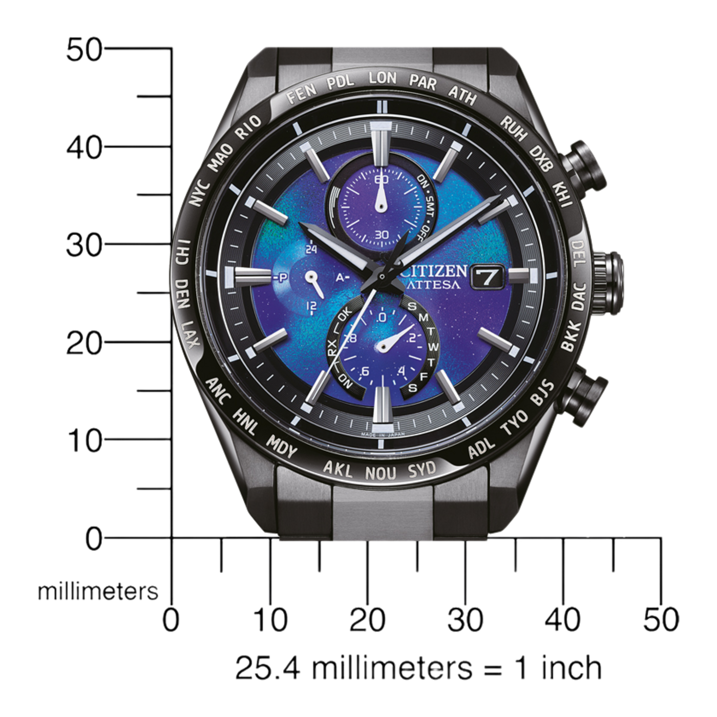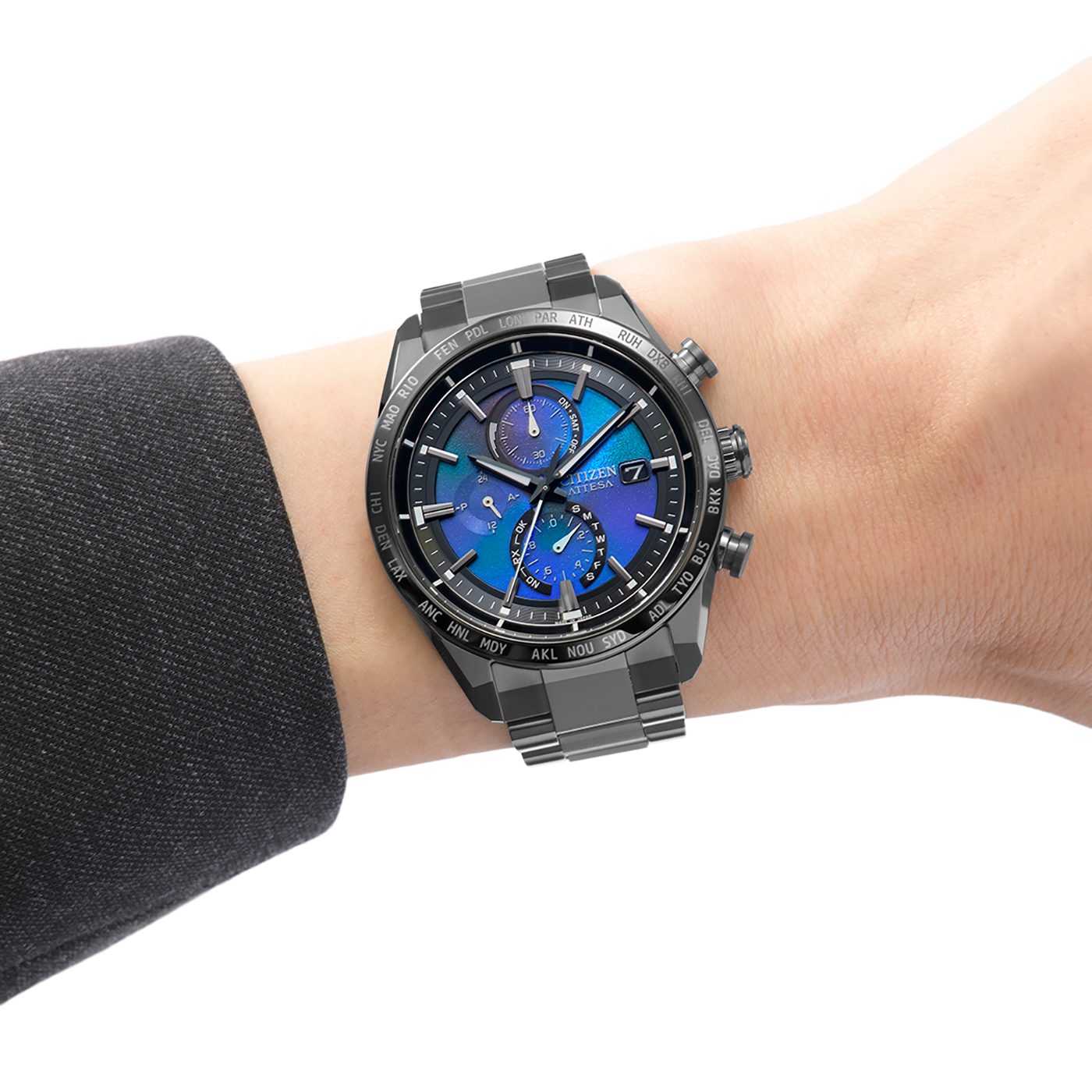Spectacular radio-controlled chronograph from the Attesa collection with black Super Titanium™ case and bracelet (Duratect DLC) , sapphire glass and shimmering dial (in collaboration with FujiFilm). Equipped with the H800 caliber with Eco-Drive power function, radio reception, world time, stopwatch function, 24-hour display, date and 10 bar water resistance. Case diameter: 42 mm, strap lug width: 22 mm, limited to 2,700 pieces worldwide.