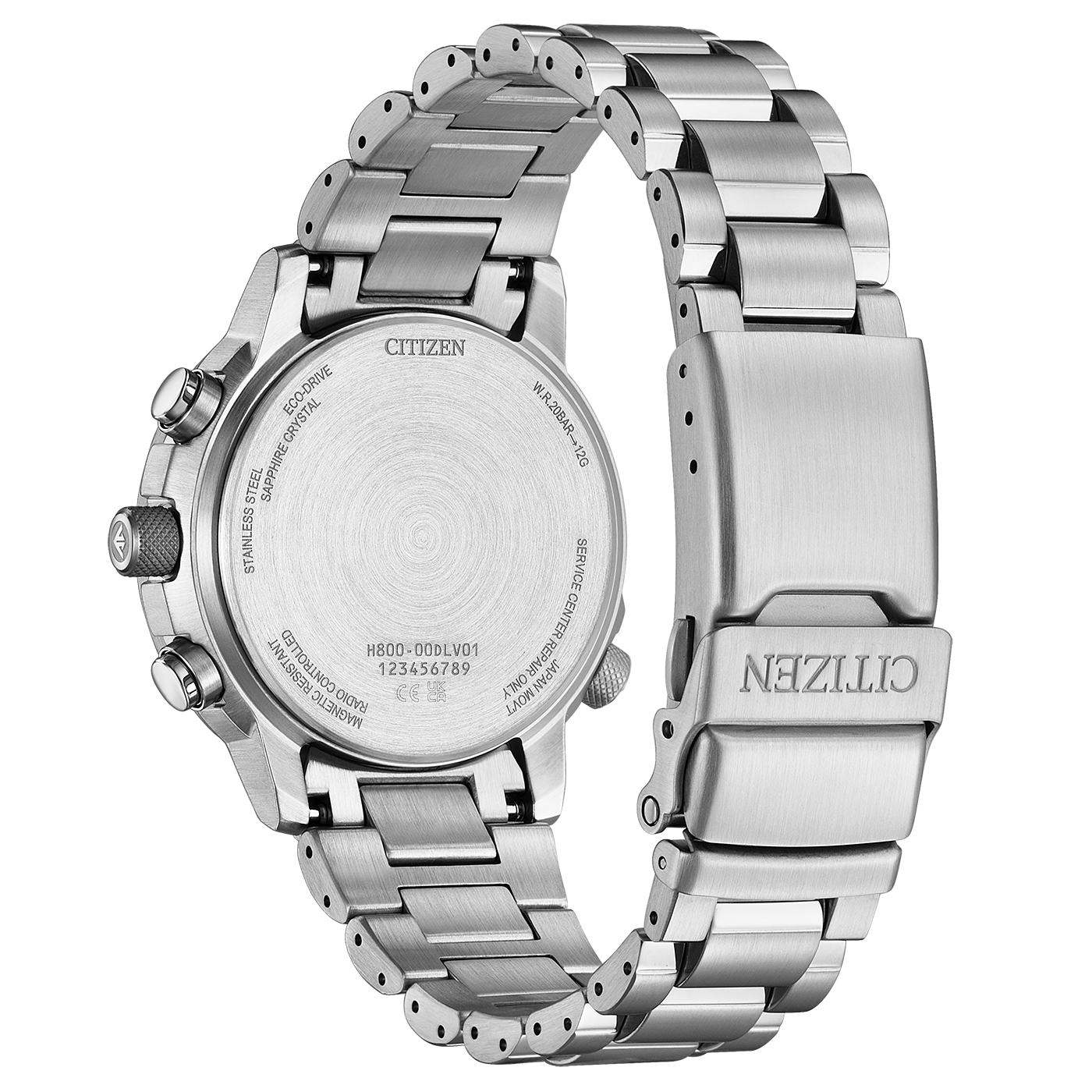 Find out more about the Citizen Promaster Sky with the precise Eco-Drive calibre H800. This silver-coloured stainless steel case, measuring 41 mm in diameter and 11.62 mm in height, houses an analogue chronograph with extensive functions: 24-hour display, anti-magnetic, battery discharge indicator, perpetual calendar and stopwatch up to 60 minutes with 1/20-second accuracy. The radio clock synchronises worldwide (EUR, JPY, USA, China) and offers time zones for 26 cities as well as World Time. The anti-reflective sapphire glass protects the black dial with clear line indices. The solid stainless steel strap has a secure double push clasp. With water resistance up to 20 bar and a power reserve of 180 days, this watch is a great everyday partner – no need to change the battery.