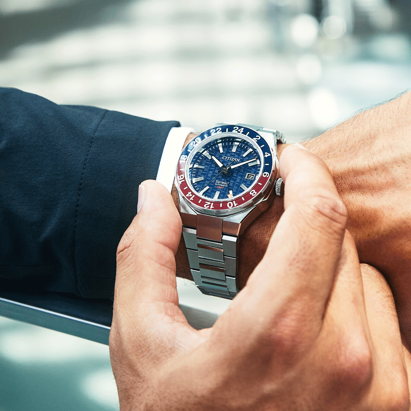 Montre automatique de la collection Series 8 avec fonction GMT. Avec boîtier et bracelet en acier inoxydable, verre saphir, cadran bleu texturé et lunette rouge-bleu. Équipée du calibre mécanique 9054 avec 50 heures de réserve de marche, précision de -10/+20 secondes/jour et étanchéité à 10 bars. Diamètre du boîtier : 42 mm.
