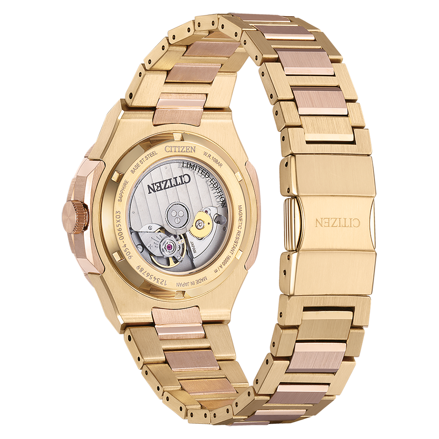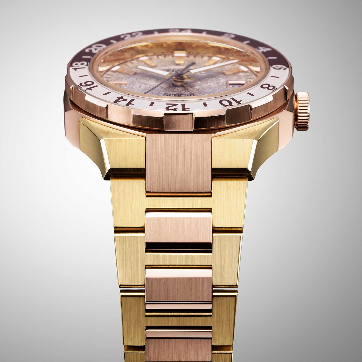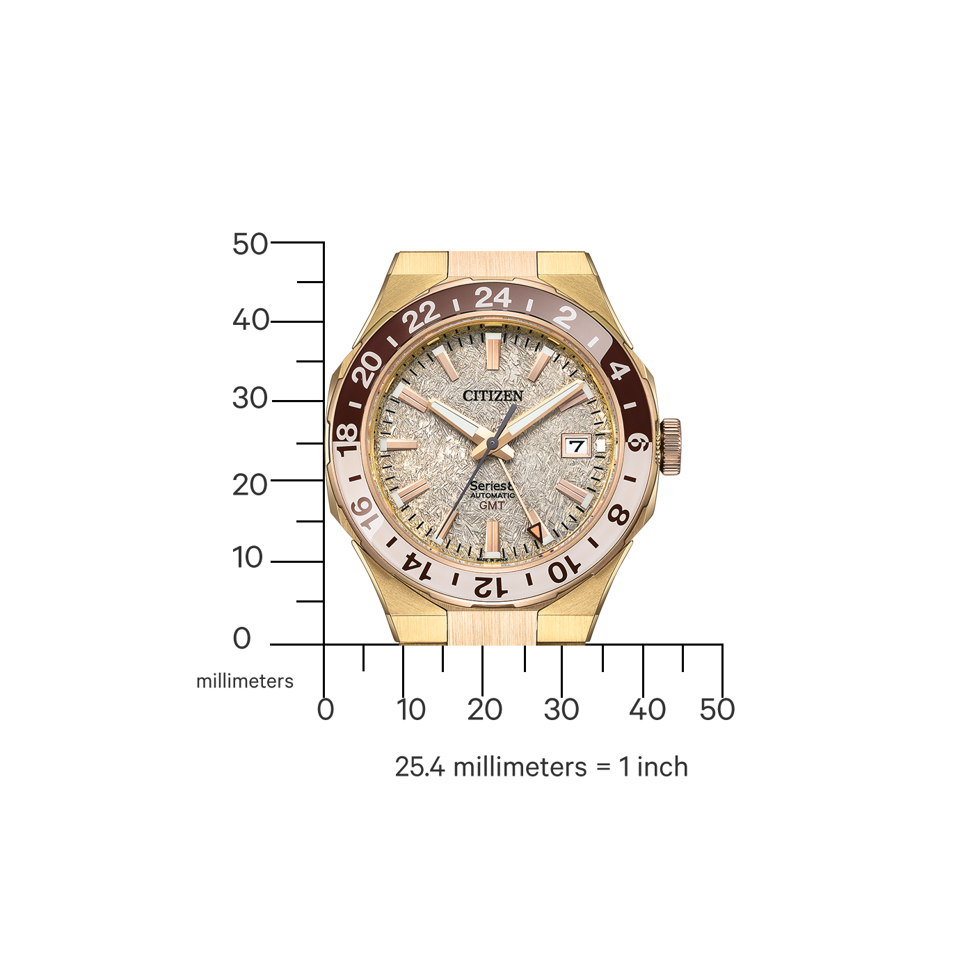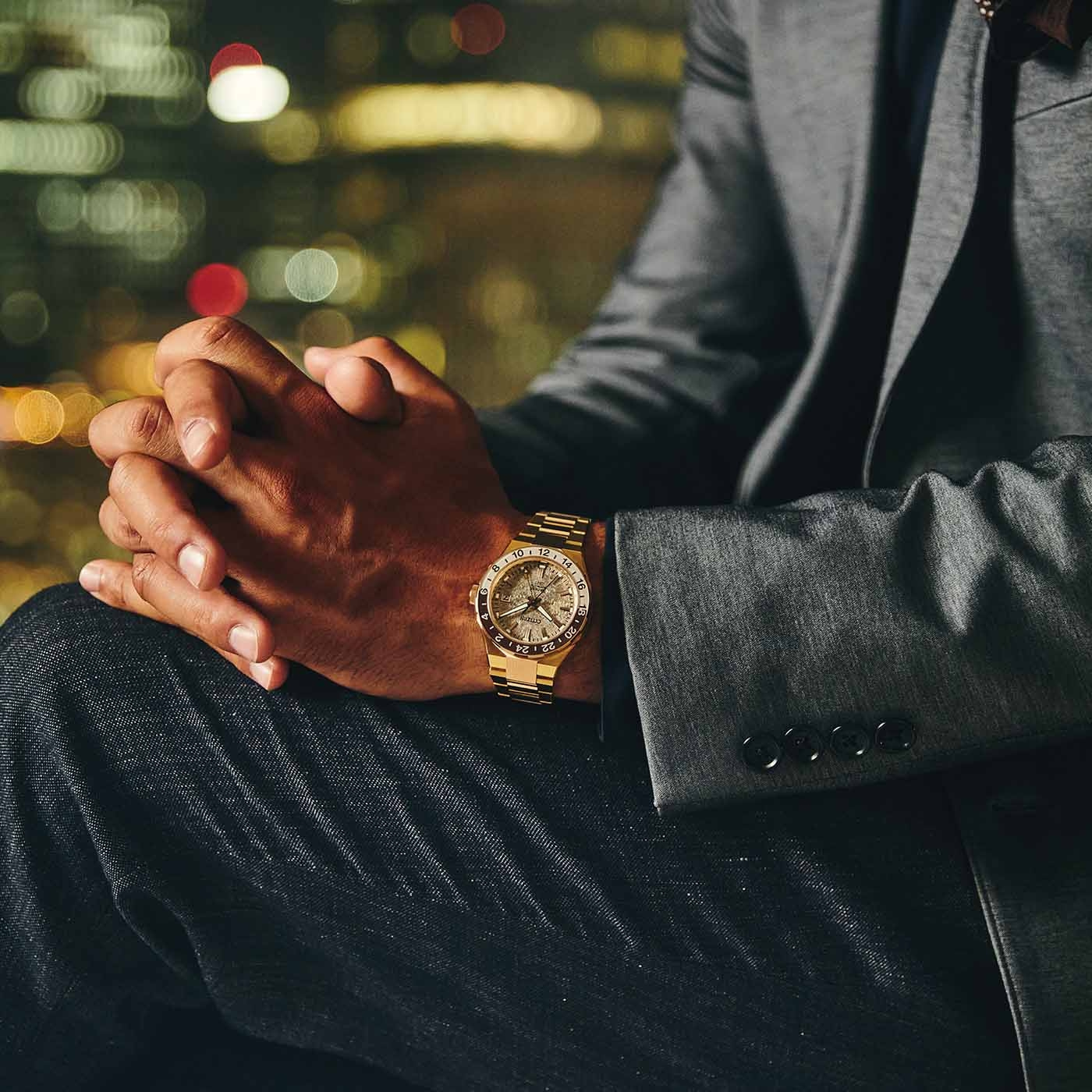 Eye-catching automatic watch from the Series 8 collection with GMT function. With gold-colored stainless steel case and bracelet, sapphire glass, textured gold-colored dial and beige-brown bezel. Equipped with the mechanical caliber 9054 with 50 hours power reserve, -10/+20 seconds accuracy/day and 10 bar water resistance. Case diameter: 42 mm, limited to 1,300 pieces worldwide.